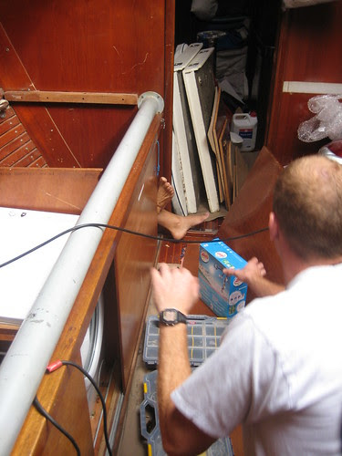 Look very carefully, here; there are two people in this photo. Andrew (part of the refit gang) is entirely underneath the washer and workbench, halfway in the bilge, I think!
